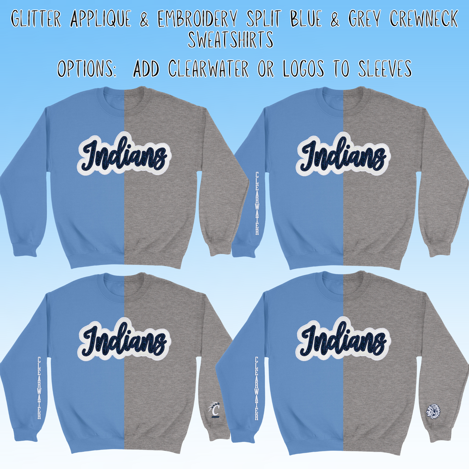 Clearwater- Indians Glitter Applique and Embroidered Split Two Toned Blue & Grey Crewneck Sweatshirt, Sleeve Options