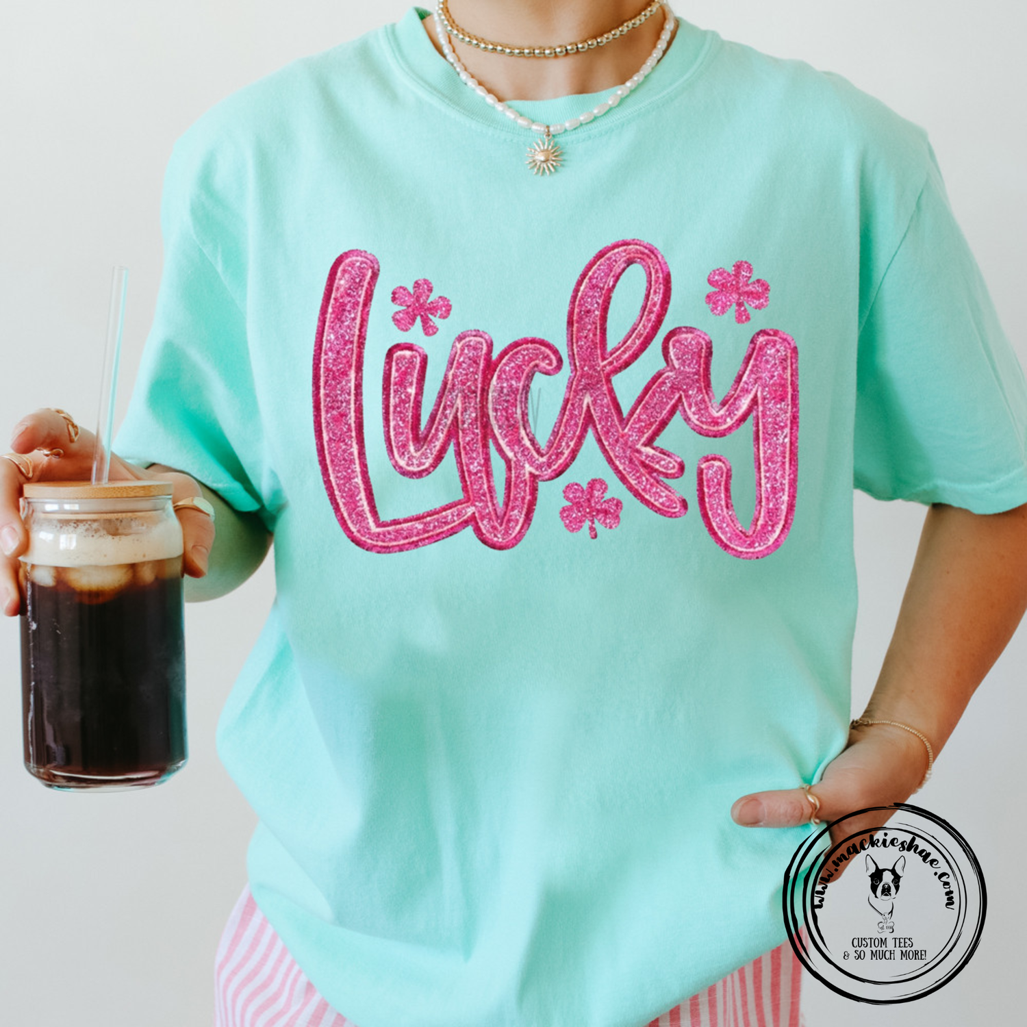 Lucky Pink Faux Patch Custom Shirt, Comfort Color Chalky Mint Short Sleeve